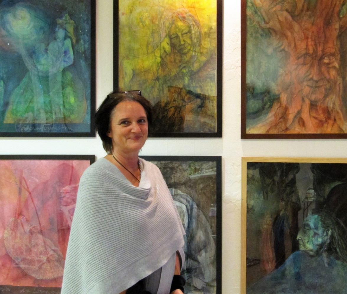 Cordula Nitschke vor einem Ausschnitt ihres Gemäldezyklus